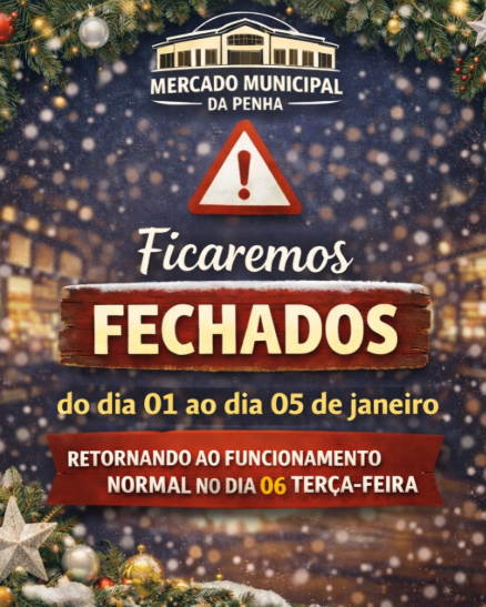 15/12/2025 Horários especiais de funcionamento do Mercado Municipal da Penha para o final do ano: 22/12 (segunda-feira): 08:00 às 19:00 23/12